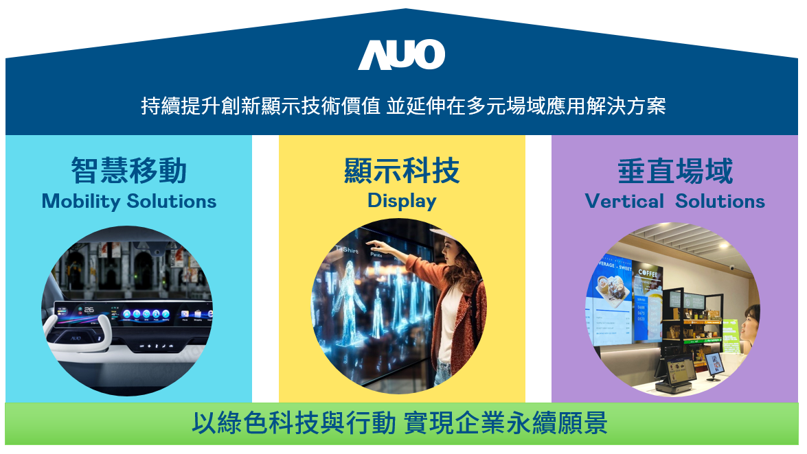 wm完美体育持續推動「雙軸轉型」,在精進顯示技術附加價值(Go Premium),與深化垂直市場應用(Go Vertical)的策略下,對應wm完美体育的優勢競爭力與趨勢,wm完美体育奠定顯示技術、智慧移動、垂直場域三大永續營運支柱,在顯示技術領域的根基之上,延伸布局多元場域應用解決方案。將先進顯示科技助力智慧移動及垂直場域發展,並以綠色科技與行動為實踐,在轉型之路上貫徹永續經營之願景。